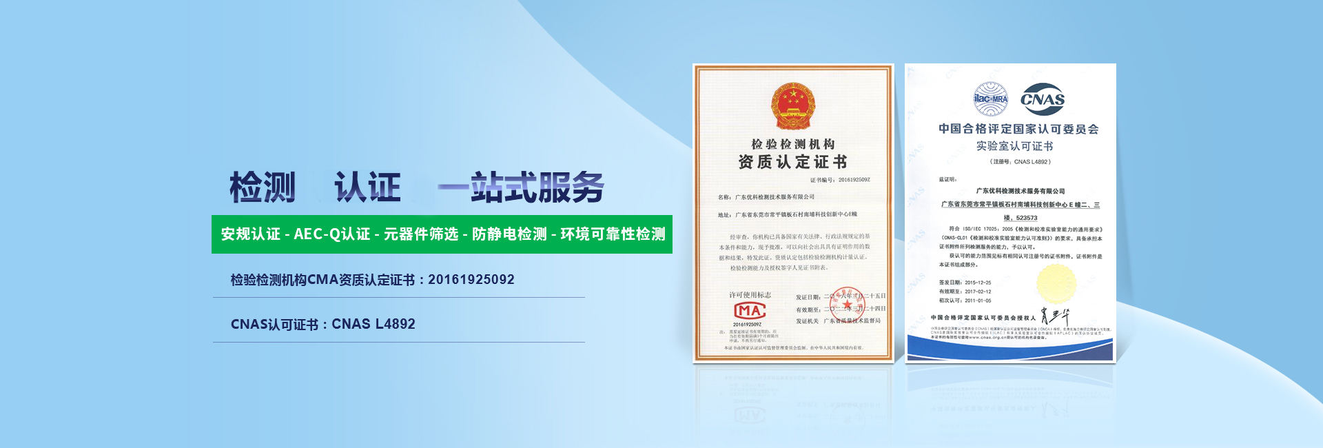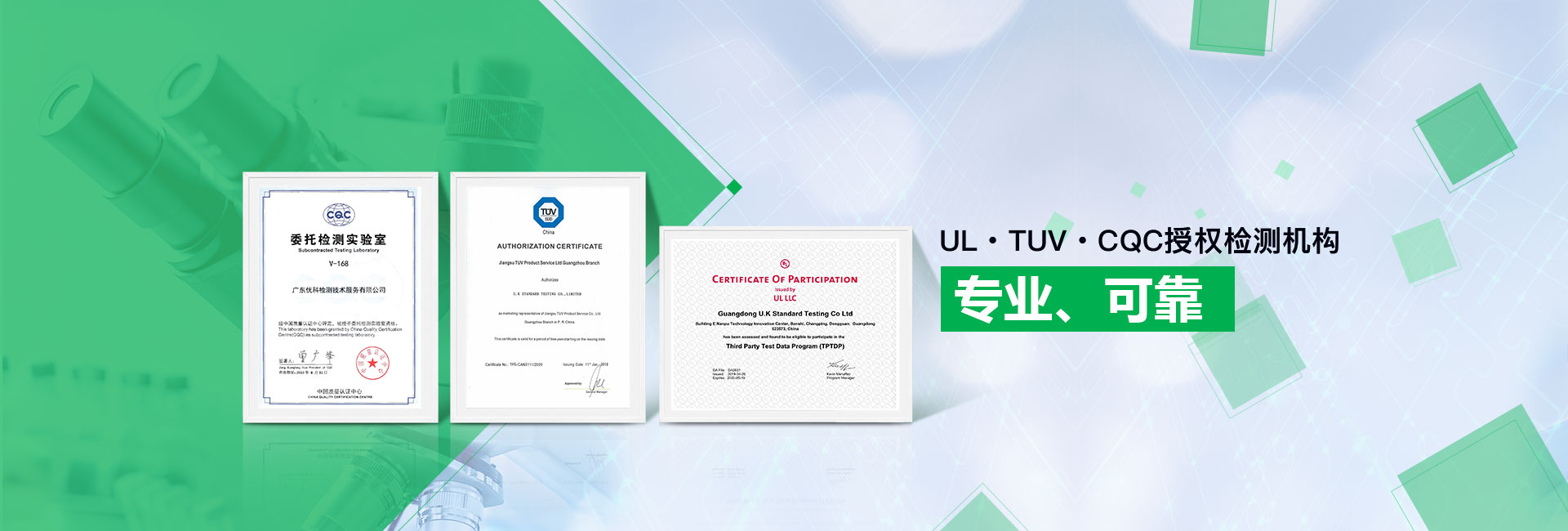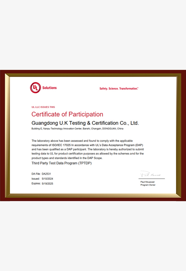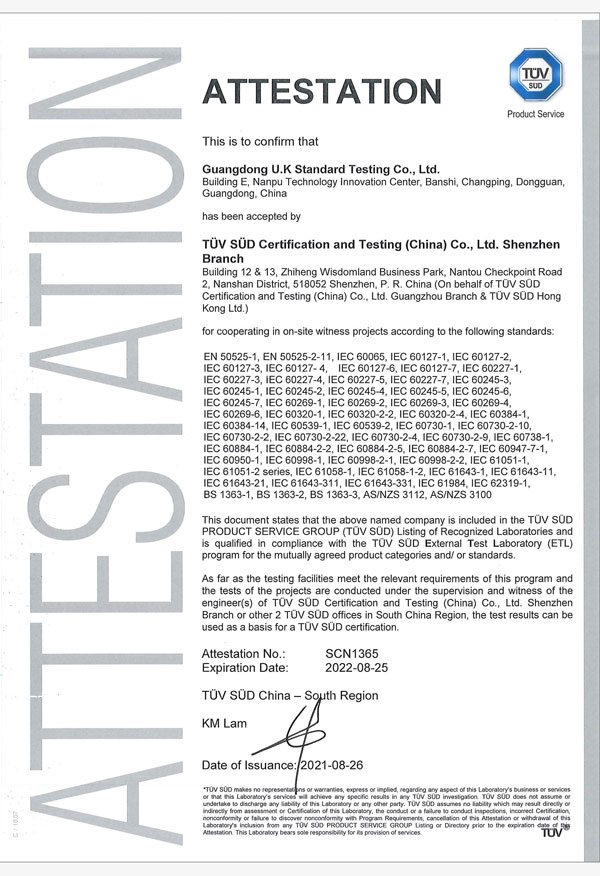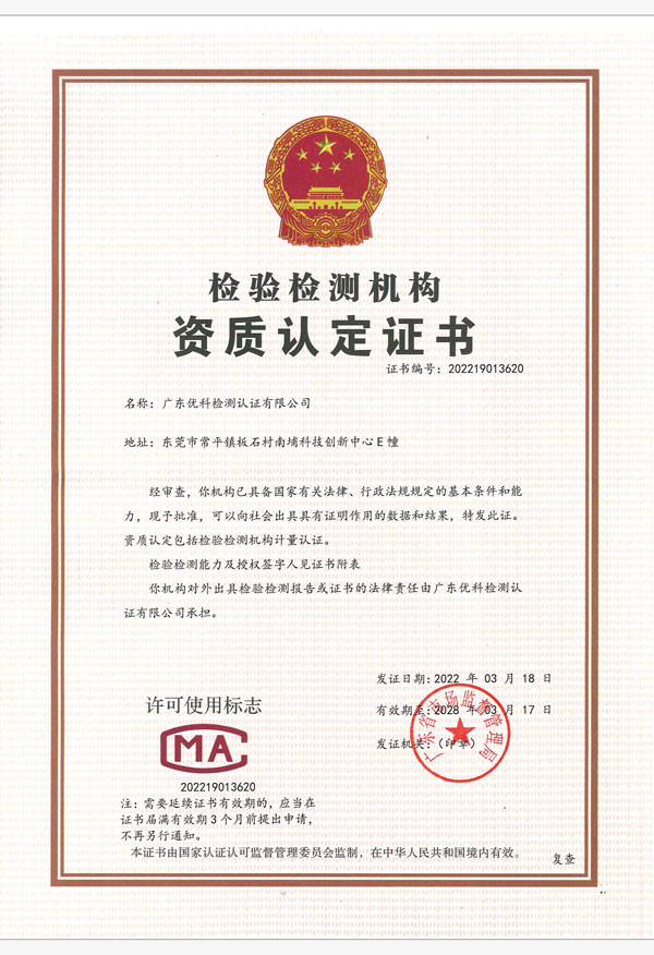 廣東優(yōu)科檢測認(rèn)證有限公司(簡稱:UKK)成?于2007年,是國內(nèi)專業(yè)的汽車整車及零部件、電子元器件第三方檢測實驗室,國家級中小企業(yè)公共(技術(shù))服務(wù)示范平臺,獲得了國家?新技術(shù)企業(yè)、廣東省專精特新中小企業(yè)、市級工程技術(shù)研發(fā)中心等榮譽(yù)稱號。 More